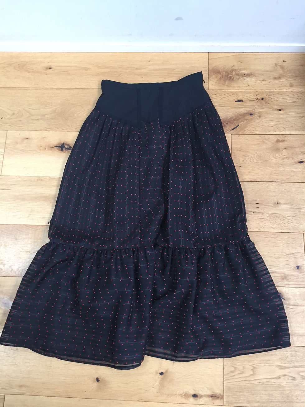赤のドット柄が子供っぽくなるかと思いきや、膝下が透けが大人感を出してくれます。